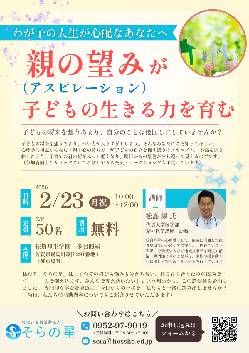 2月23日(月・祝)、佐賀大学医学部 精神医学講座 助教の松島淳先生をお招きし、「親の望み(アスピレーション)が子どもの生きる力を育む」というテーマでお話しいただきます。 親の「アスピレーション」がいかにして子どもの「生きる力」を育んでいくのか、その驚きのメカニズムについて、心理学的な視点から紐解いていただきます。