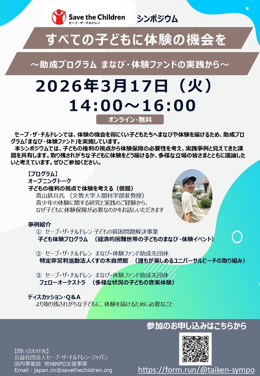 3/17(火)開催「シンポジウム『すべての子どもに体験の機会を~助成プログラム まなび・体験ファンドの実践から~』(オンライン開催)」