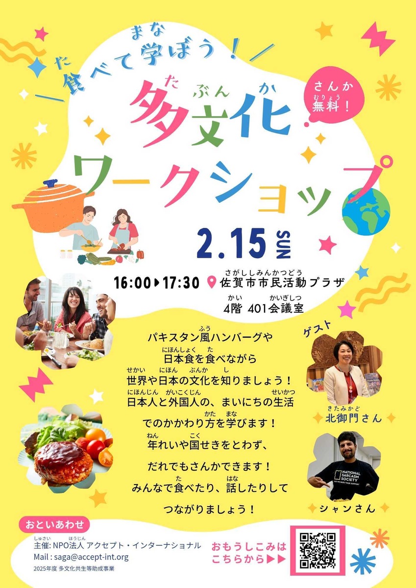 このイベントでは、佐賀県(さがけん)で、多文化共生(たぶんかきょうせい)コーディネーターとしてはたらいている北御門(きたみかど)さんと、パキスタン出身(しゅっしん)で、りょうりが大好(だいす)きな英語(えいご)の先生(せんせい)・シャンさんをおむかえします。