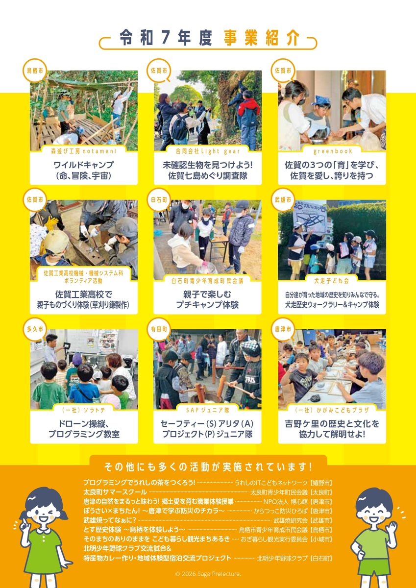- 地域の歴史、文化、偉人、史跡、職業等を学ぶメニューを盛り込み、こども達の佐賀への誇りや愛着が高まる内容となっている