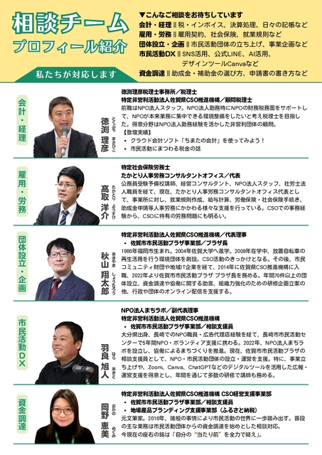 佐賀県CSO推進機構では、専門知識を持つ税理士、社労士、実務経験豊富なアドバイザーを、あなたのまちへ派遣(出張相談)し、お悩みを解決するサポートを行っています。
