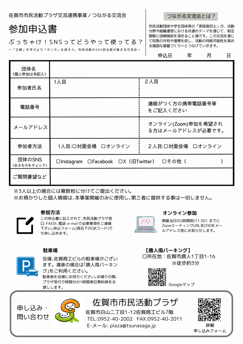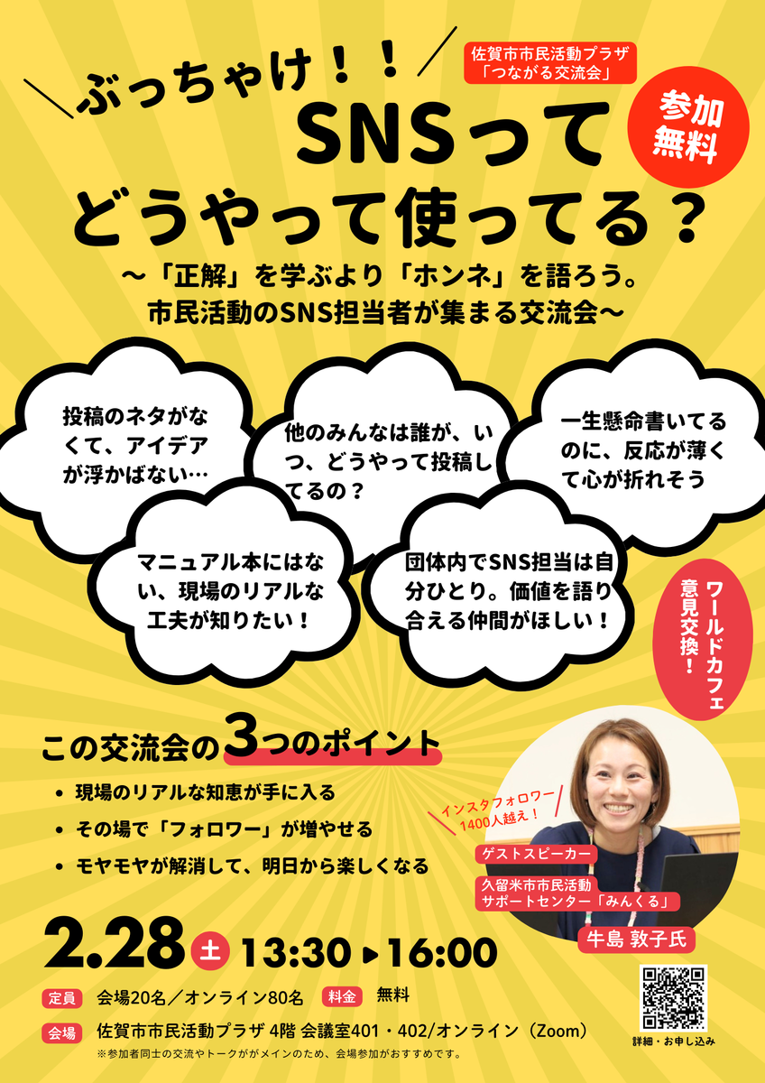 2/28(土)開催「佐賀市市民活動プラザつながる交流会『ぶっちゃけ!!SNSってどうやって使ってる?』(オンライン併用)」